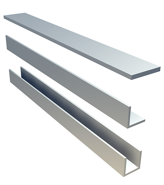 A collection of geometric extrusions including flats, angles, box sections and channels.