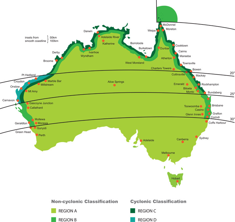 - Region A is 90% of Australia; Region B is coastal northern NSW and the Gold Coast; Region C is cyclonic and Region D is severe cyclonic and is only applicable to areas around Karratha.